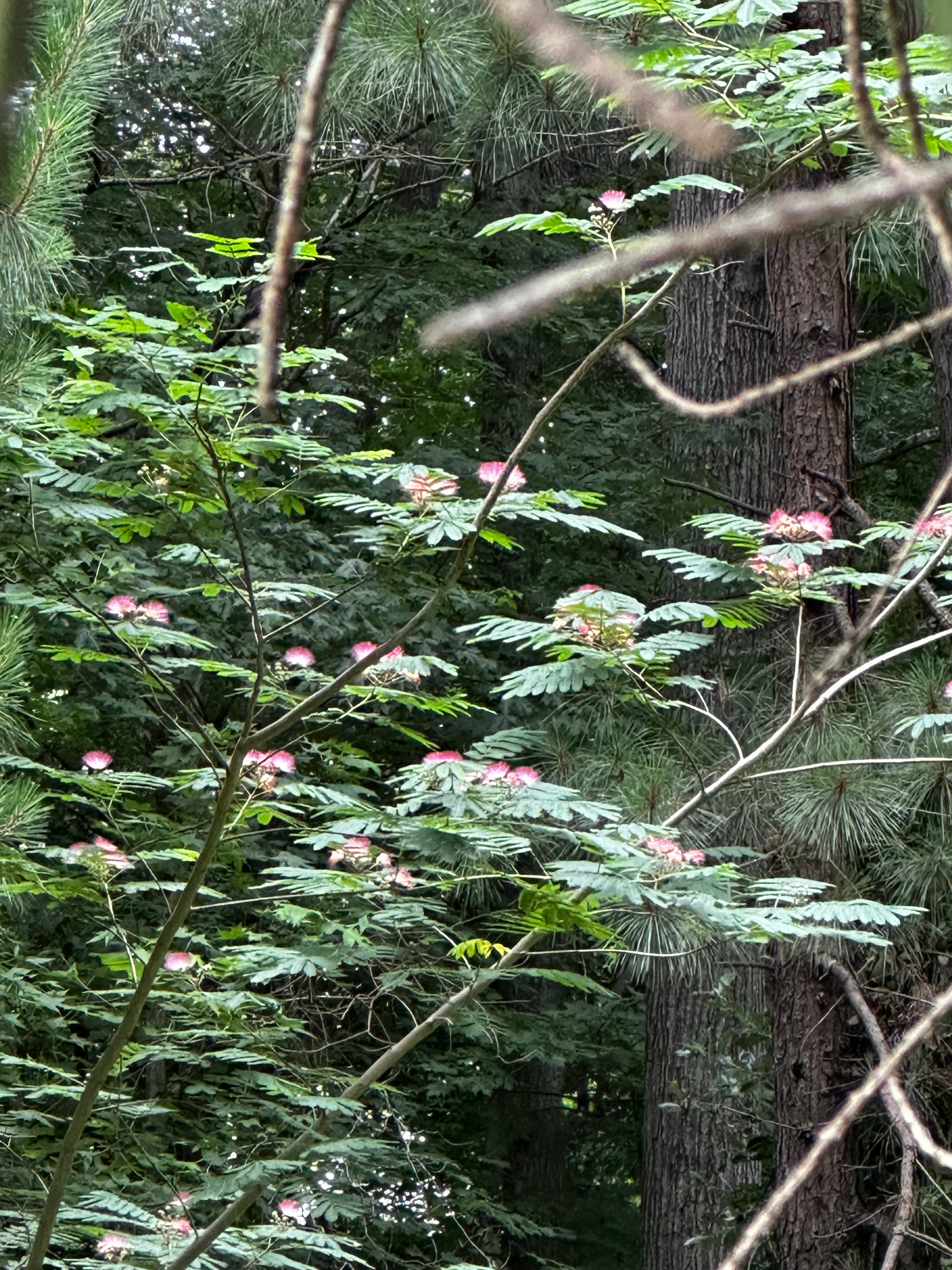 on my walks, sometimes i remember to look up, and when i do, i am treated to the beauty that is the pink silk tree. this lovely tree has leaves that look to me like a combination of palm leaves and ferns (looks tropical ish?)… amongst the leaves are these bright pink, feathery, wispy threads in the shape of a small fan. it is so distinctive and beautiful! i picked one fallen flower up off of the forest floor today and i definitely see how it got its name. the flower feels so delicate and soft. they may be invasive but damn are they cute!